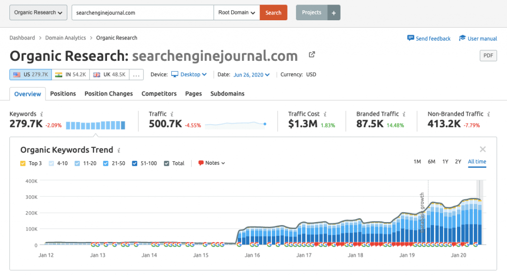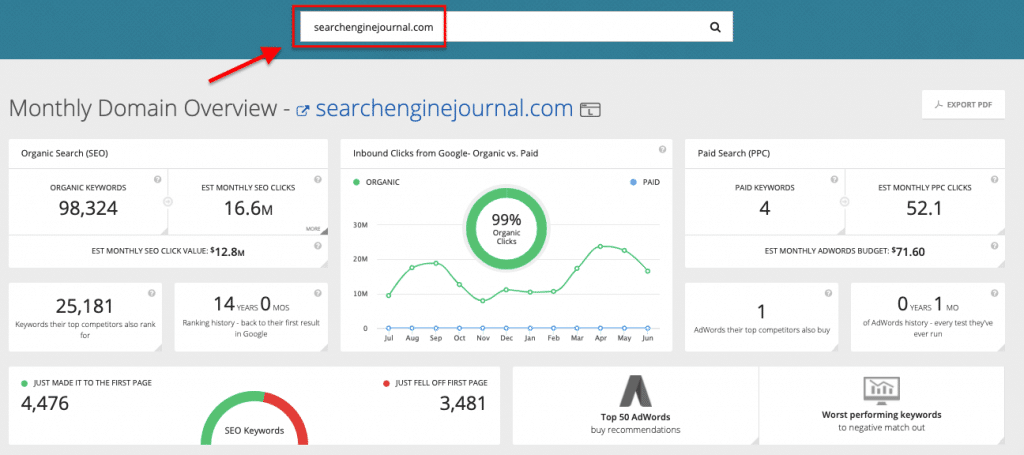 In essence, you’ll get historical data to establish any algorithmic ranking patterns and possible ranking penalties in the past, the ability to see other sites that share the same position with yours relative to your main competitors, insights on new opportunities, reports on the overall performance of your competitors’ organic and paid search campaigns, review several domains side by side to determine comparative power, plus view updates on developing competitors.