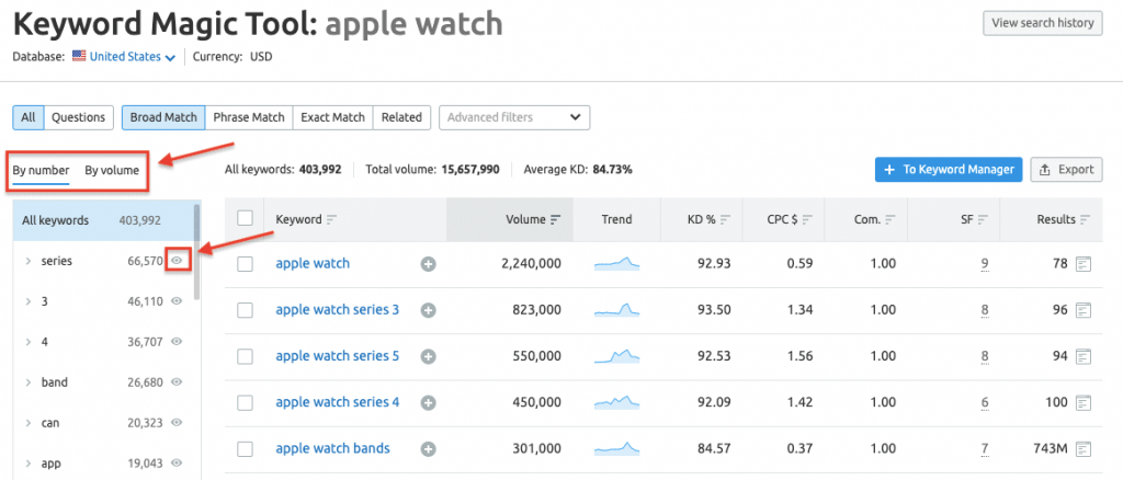 Well, of course, the list might be long and quite confusing. That’s why SEMrush also comes with a filtering tool to help you pick out specific sets of keywords that match your desired parameters.