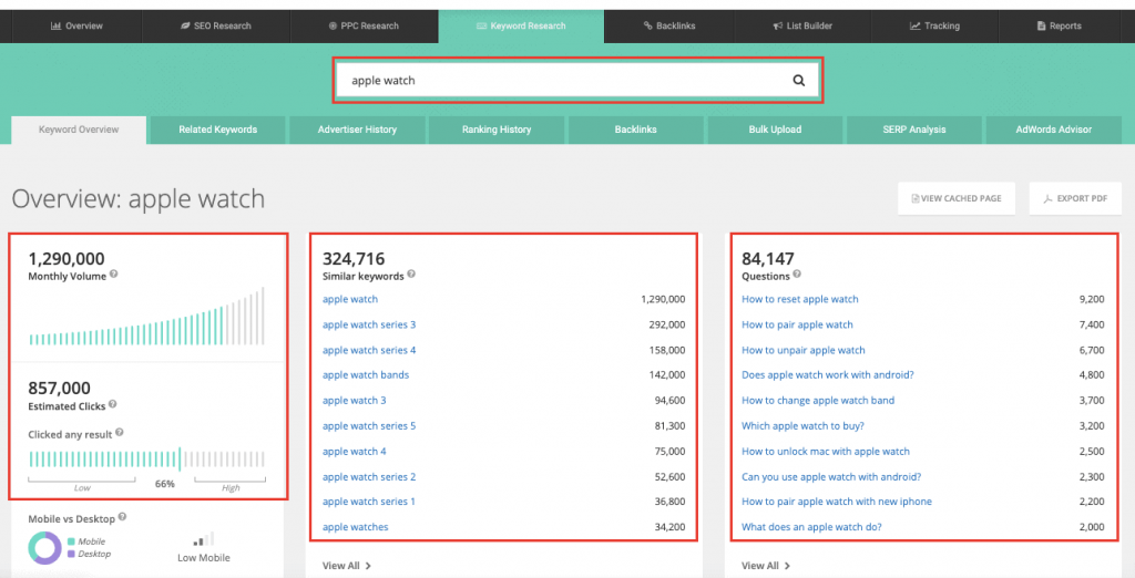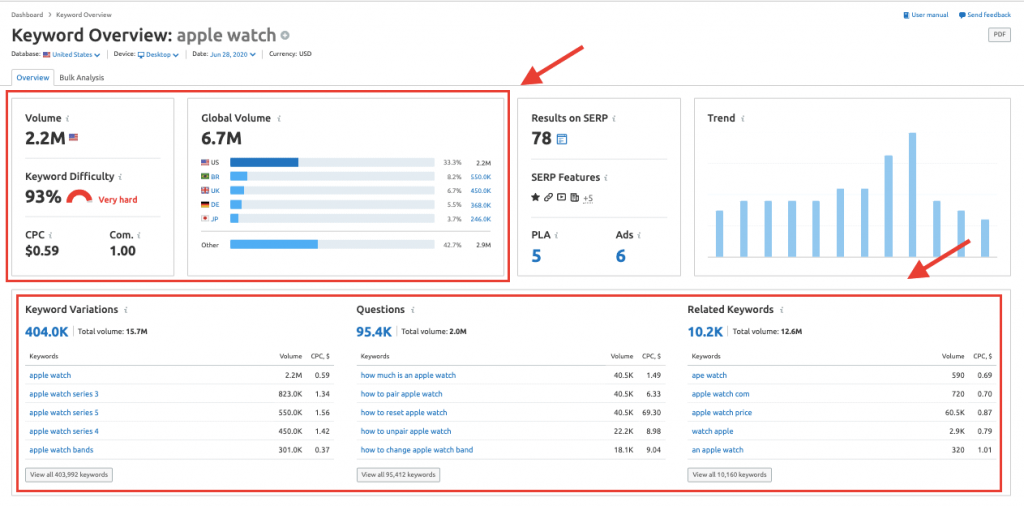 You’ll get a quick summary of all major keyword metrics (monthly volume, estimated clicks, etc.) and a list of similar keywords and question-based keywords.