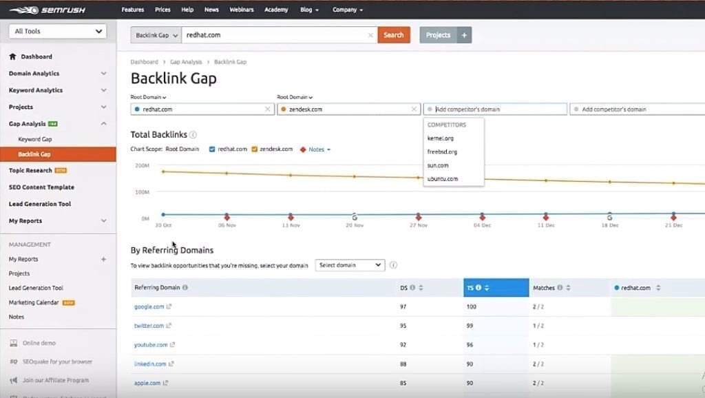 SEMrush is also fairly decent in link review. It crawls through websites to identify incoming links, then generates information on their performance against competitors, all link sources, plus overall link strength.