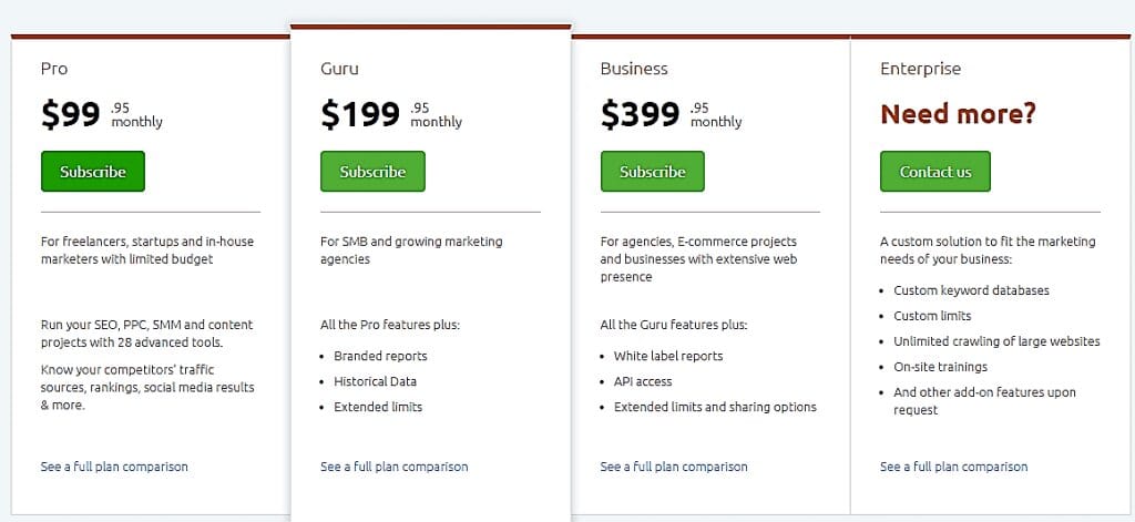 Business Plan– Optimized for enterprises with a large web presence, e-commerce projects, and large agencies. It costs $399.95 per month, or $3999.40 if you prefer paying annually to save $800. In addition to SEMrush standard features, you’ll get: