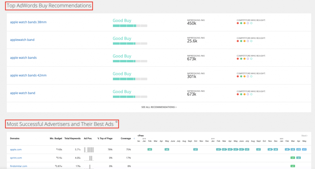 Below this data, you’ll find a wealth of PPC keyword data in the “Top AdWords Buy Recommendations” and “Most Successful Advertisers and Their Best Ads” sections.