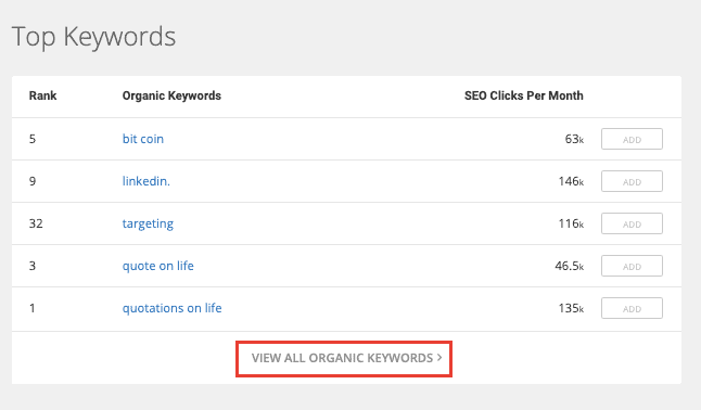 To perform competitor-based keyword research on SpyFu, simply type in your competitor’s domain in the search box, and once you get the overview report, navigate to the “Top Keywords” section of the report and click on “View all organic keywords” at the bottom of the table.